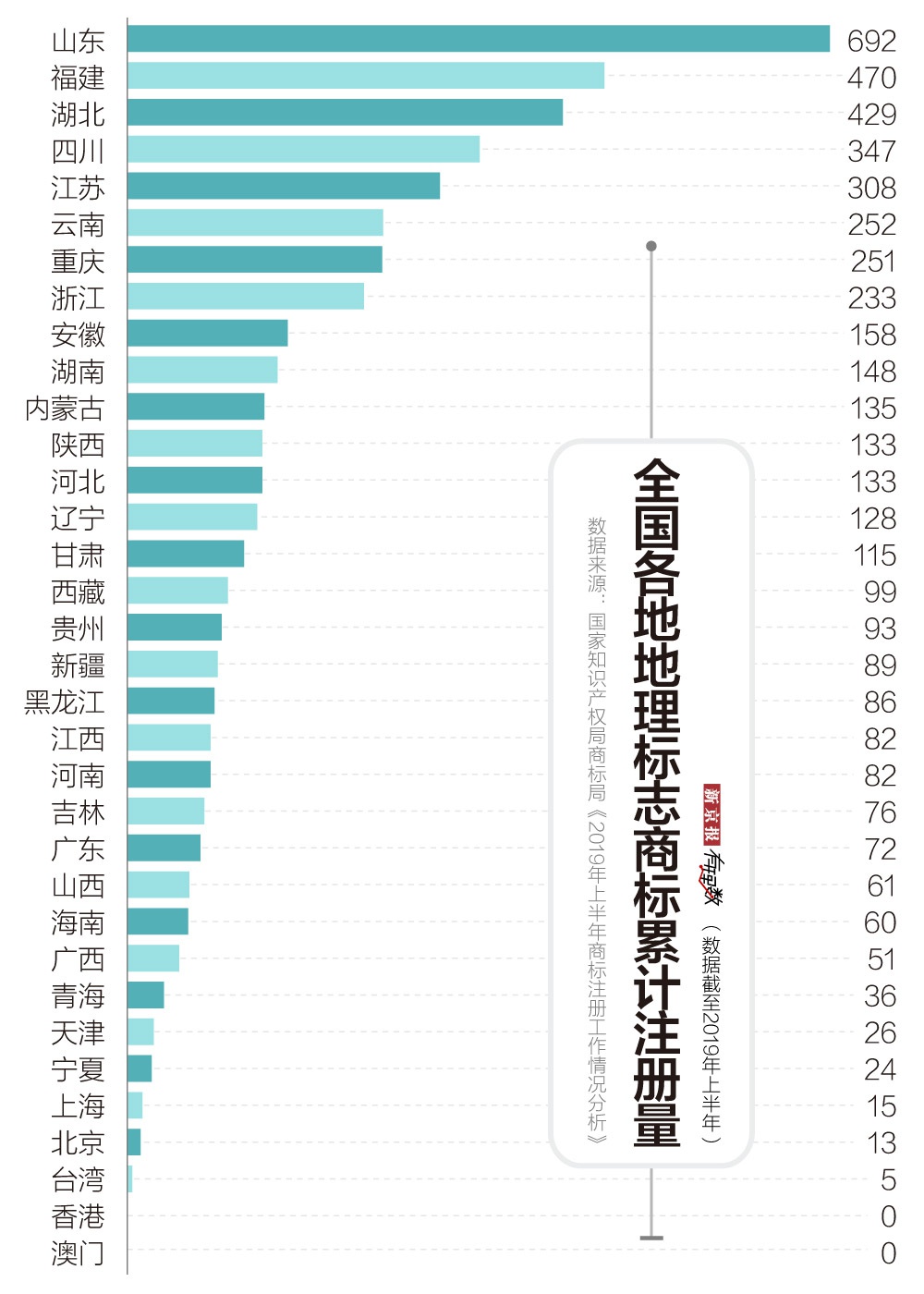 下图是截至2019年上半年时,全国地理商标数量的排行,山东(692件)、福建(470件)、湖北(429件)位列前三。