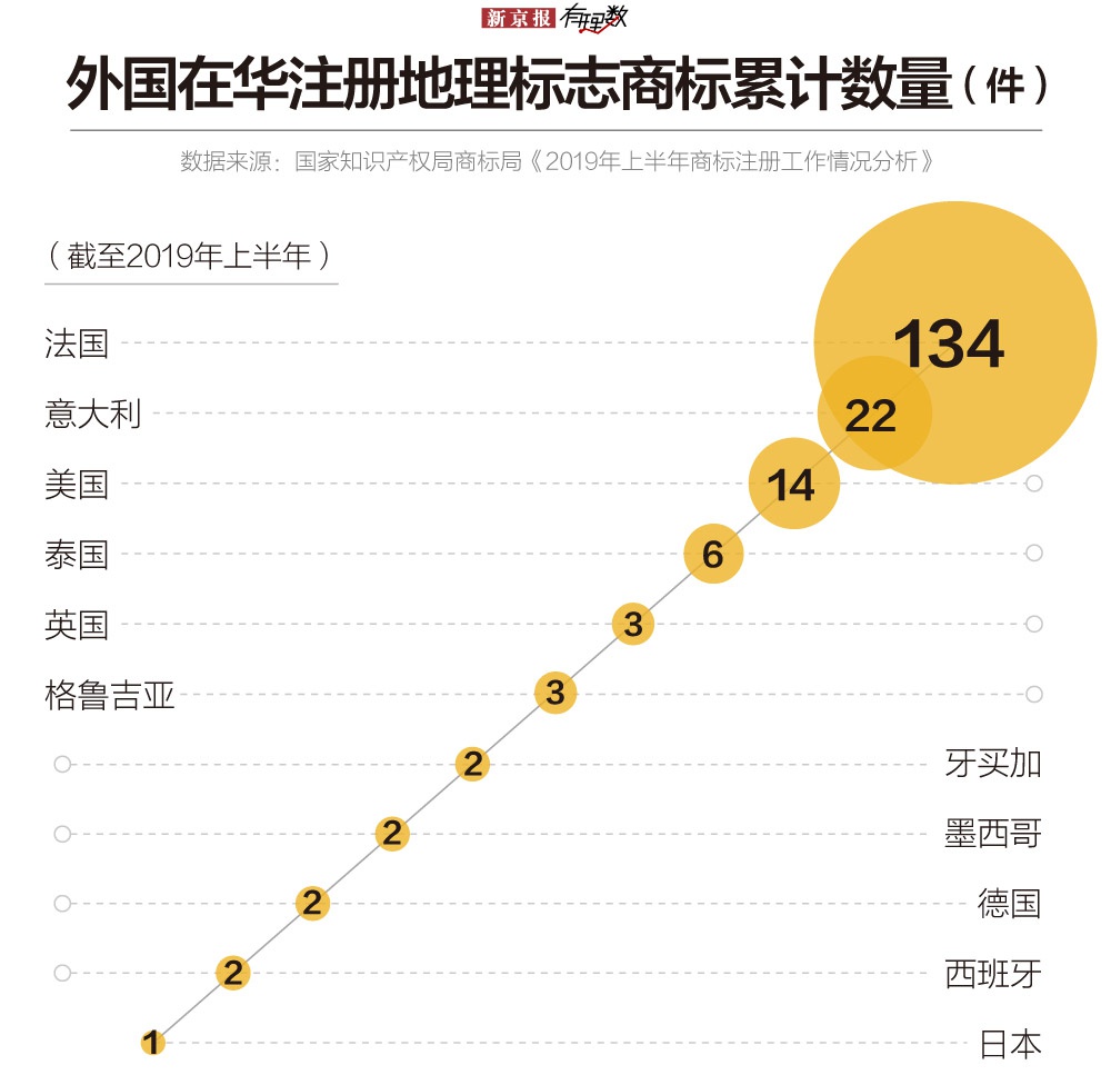 截至2019年上半年,国外在华注册“地理标志商标”数量最多的前三个国家是:法国(134 件),意大利(22 件)、美国(14 件)。法国遥遥领先。