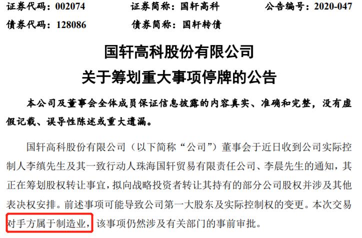 5月19日晚间,国轩高科发布《关于筹划重大事项停牌的公告》,公告显示,国轩高科董事会于近日收到公司实际控制人李缜及其一致行动人珠海国轩贸易有限责任公司、李晨的通知,其正在筹划股权转让事宜,拟向战略投资者转让其持有的部分公司股权并涉及其他表决权安排。这一事项可能导致公司第一大股东及实际控制权的变更。