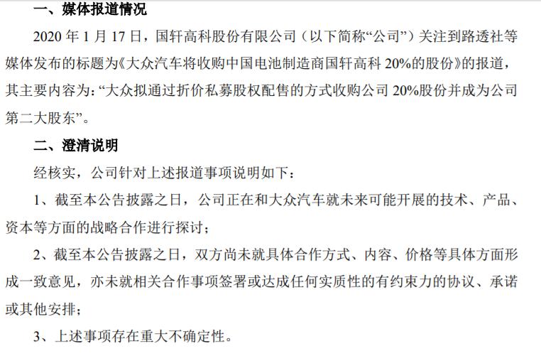 对此,国轩高科的回应中除了否认董事会已经获悉的消息外,对于大众汽车入股,还是坚持之前的“暧昧”态度。