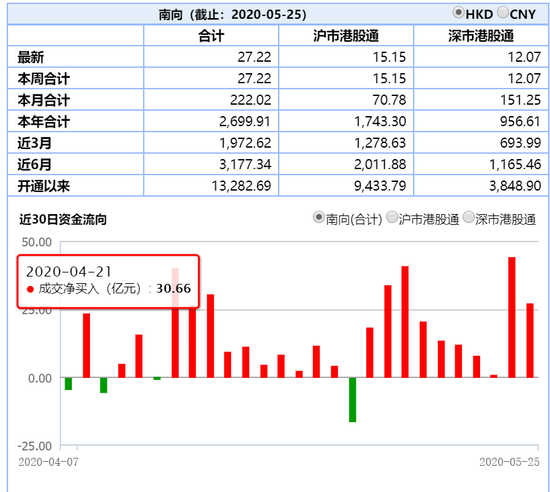 5月25日消息,截至港股股市收盘,南下资金净流入27.22亿港元,上周五在港股暴跌5.6%之际流入44.14亿港元。
