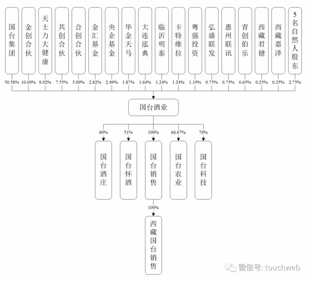 IPO前,国台集团直接持有国台酒业50.58%的股份,同时通过金创合伙、共创合伙和合创合伙间接控制国台酒业23.53%的股份,为公司控股股东。