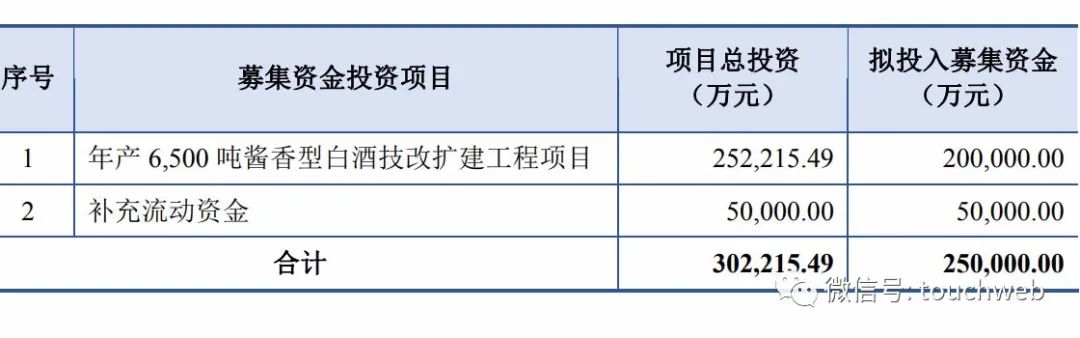 此次融资主要用于两方面:1,年产6500顿酱香型白酒技术扩建工程项目;2,补充流动资金。