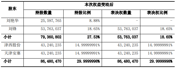 在股权转让的同时,刘艳红将承诺放弃剩余8.88%股份表决权。经此交易,刘锋、刘艳红持有的表决权比例将下降为18.65%;津西股份(及一致行动人)表决权比例将上升为30%,成为上市公司控股股东,韩敬远将成为实控人。