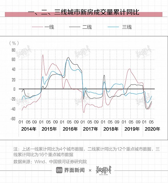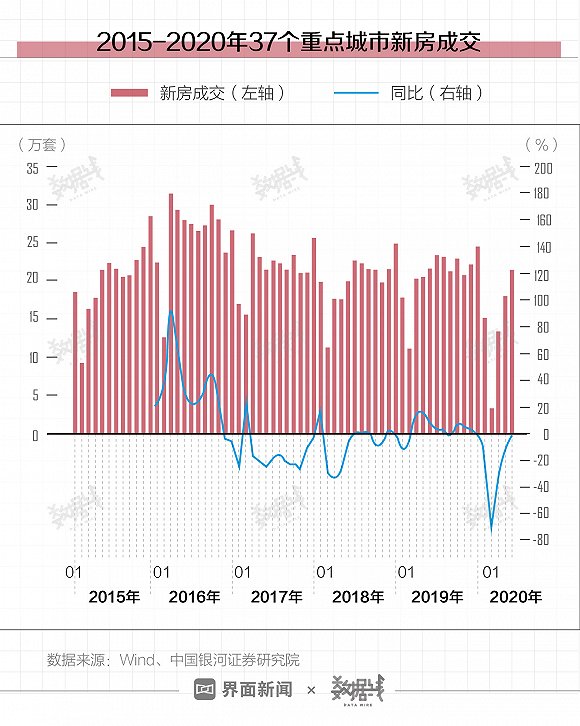 Wind数据显示,2020年1-5月37个重点城市新房销量累计同比下降22.0%,较上月收窄6.6个百分点。其中,5月新房销量同比增速-0.6%,较上月回升11.5个百分点,基本恢复到去年同期水平。