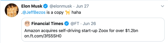 美东时间6月27日,马斯克发推特@亚马逊CEO贝索斯称,贝索斯(Jeff Bezos)是“抄袭狗”。