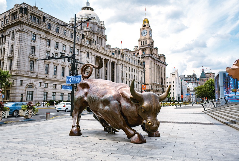 改革开放以来,我国金融业实现历史性跨越,建立起具有自身特色的现代金融体系。《关于进一步加快推进上海国际金融中心建设和金融支持长三角一体化发展的意见》提出了30条具体措施,推动上海成为金融改革开放排头兵。图为2020年7月30日,上海外滩蓝天白云映衬下的外滩牛。 人民图片 王初/摄