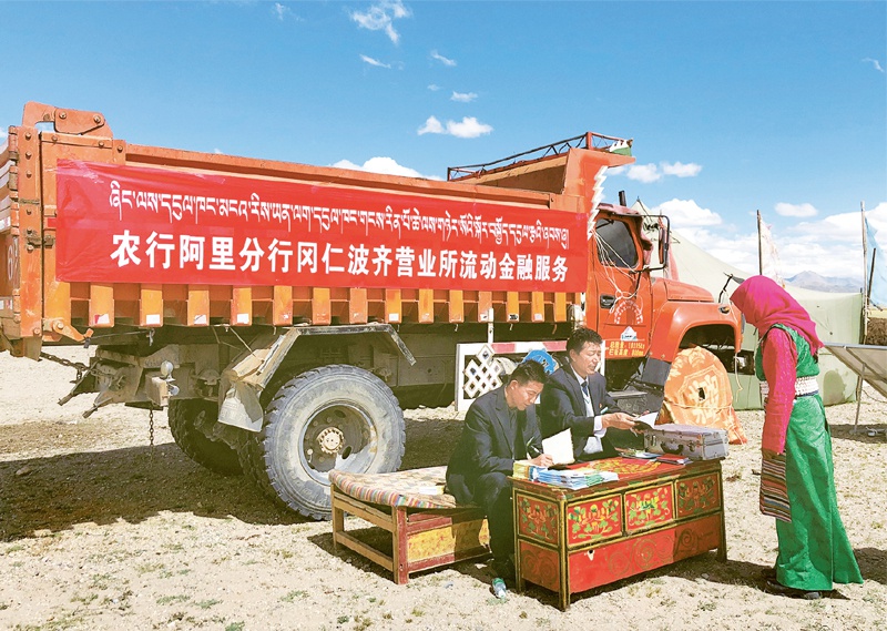 近年来,一些银行积极探索,提高金融服务的可得性、覆盖率和满意度,打通金融服务“最后一公里”,有效地推动了普惠金融的发展。中国农业银行(3.250, 0.01, 0.31%)在西藏地区充分运用“背包银行”、“马背银行”、“汽车银行”等方式开展流动金融服务,让农牧民“足不出村”就能享受到便捷高效的金融服务。图为农行阿里分行冈仁波齐营业所工作人员在为农牧民办理贷款证年审业务。 中国农业银行供图 巴桑次仁/摄