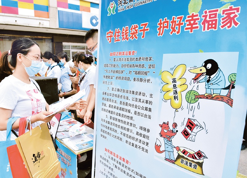 世界上没有高回报低风险的金融产品,更没有所谓“稳赚不赔”的理财产品,宣扬“保本高收益”就是金融诈骗。为进一步提高社会公众防范非法集资能力,保护人民群众合法利益,2020年6月15日,河北省石家庄新乐市金融办等20多家相关单位,联合举办“守住钱袋子 护好幸福家”防范非法集资宣传活动。图为市民在展板前查看相关介绍。 中新社发 贾敏杰/摄
