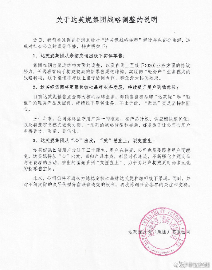 @中新经纬 9月1日消息,8月31日,达芙妮官方发布说明称:公司关注到部分消息对“达芙妮转型战略”解读存在部分曲解,特声明,达芙妮集团从未彻底退出线下实体零售。未来,公司仍然将不遗余力地稳定核心品牌达芙妮和鞋柜线下渠道。
