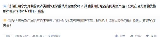 投资者在互动易提问,关注海鸥住工的瓷砖类整体卫浴技术。