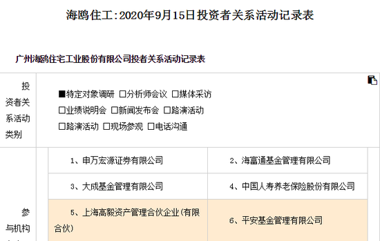 9月15日,中国人寿、高毅等机构调研海鸥住工。