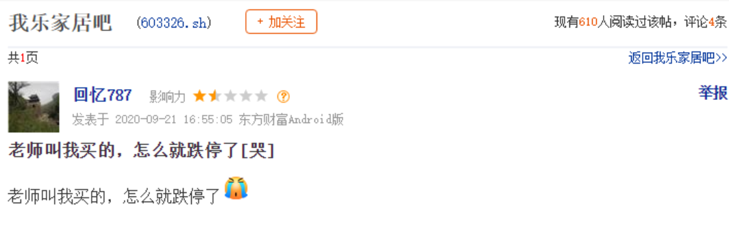 浏览股吧发现,确有不少股民反映,是在“老师”的推荐下才买的我乐家居——“‘老师’叫我买的,怎么就跌停了”“没理由呀?XXX老师刚刚推荐给我的,为什么会这样子?”