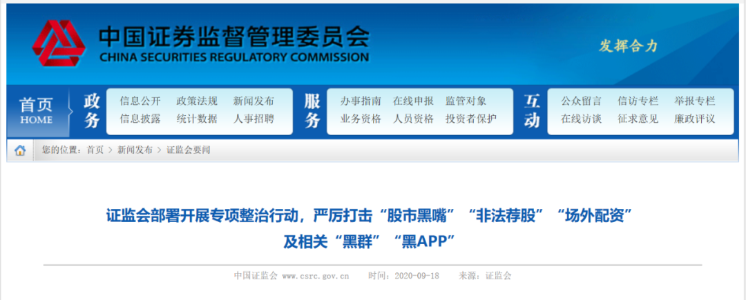 监管方面已注意到上述现象。证监会9月18日表示,近期,舆论反映“非法荐股”“股市黑嘴”“场外配资”等违法活动开始抬头,依托“黑群”“黑APP”展业,手段不断翻新,形式更加隐蔽,投资者容易上当受骗。针对上述问题,证监会部署派出机构启动了为期3个月的专项整治行动,对相关黑色产业链重拳出击。