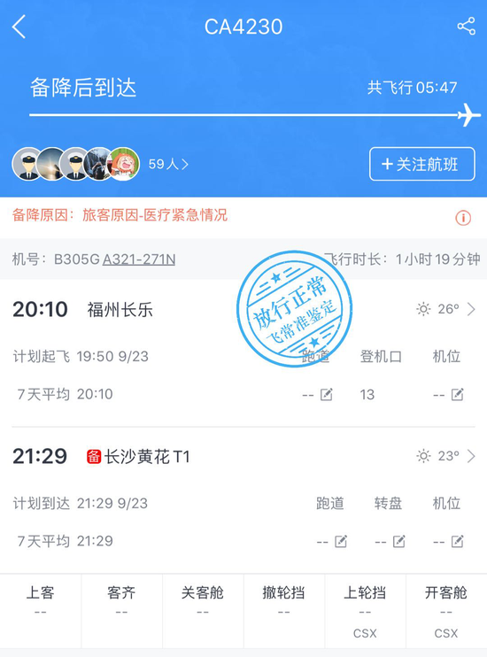 9月23日的CA4230航班备降长沙后,该急救中心确出动急救,涉事乘客被送往长沙市第八医院。