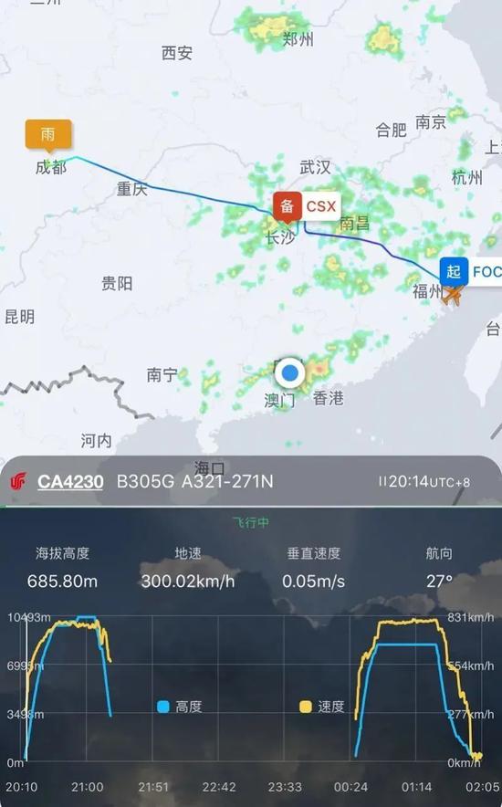 CA4230于当天20时10分从福州长乐机场出发,放行时一切正常,目的地成都。