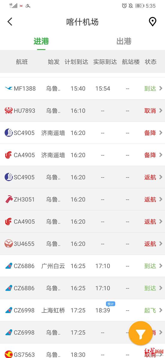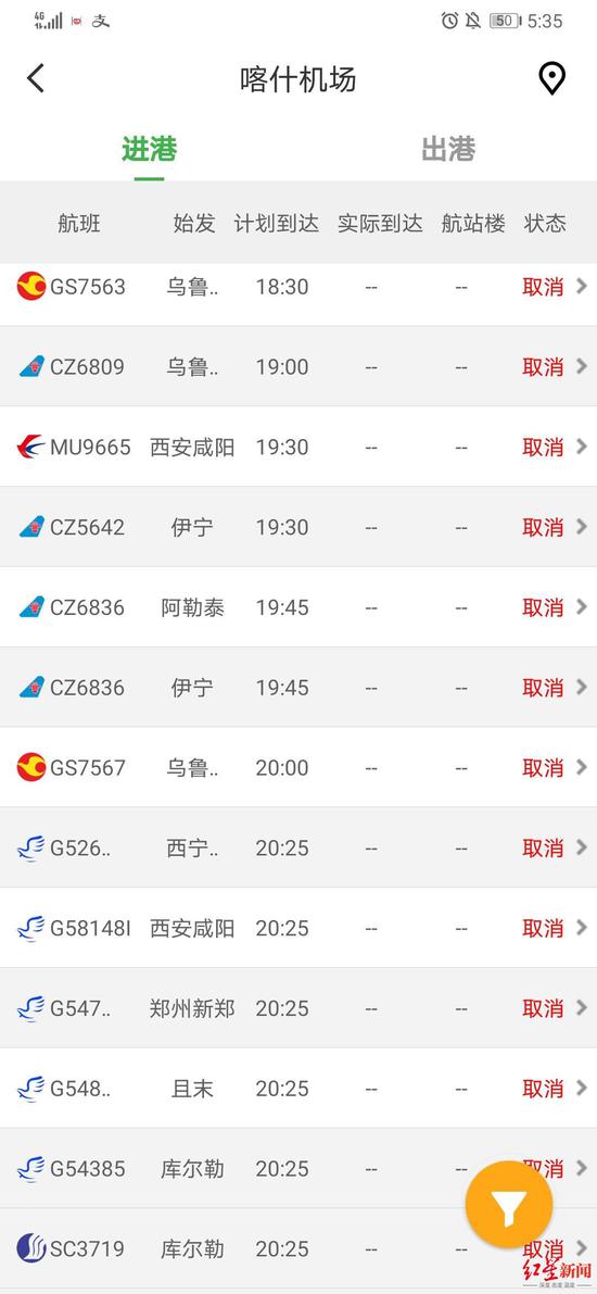 红星新闻记者通过航旅纵横APP查询发现,喀什机场今日的进出港航班从下午15时左右大面积取消或返航。